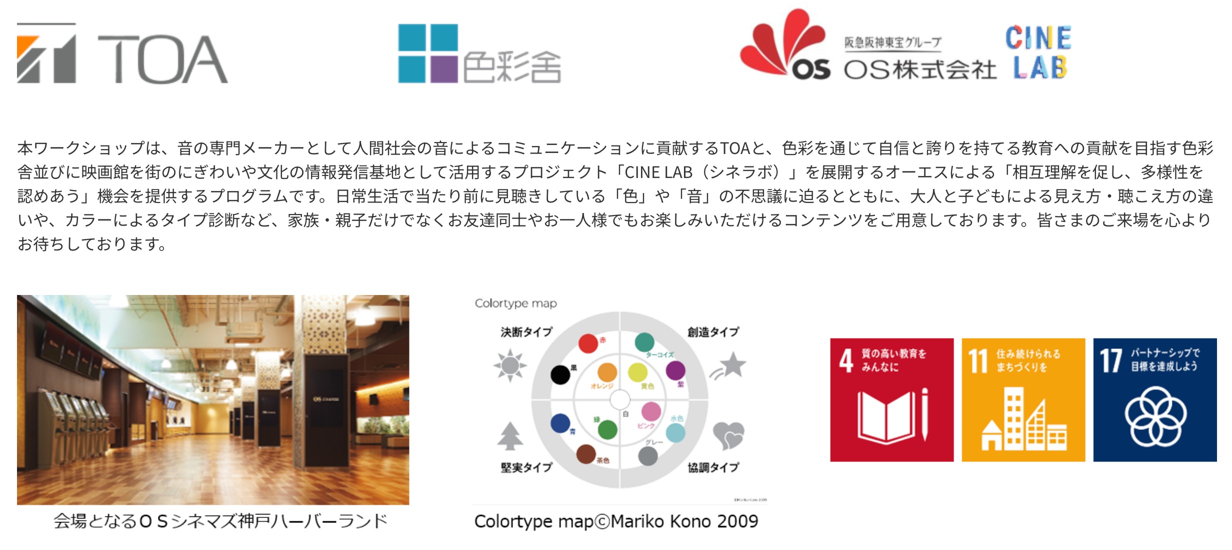 2023年3月26日(日) OSシネマズ神戸ハーバーランドにて開催されたTOA株式会社、株式会社色彩舎主催の体験型ワークショップ「家族で感じる、色と音のワークショップ」において、ワークショップで使用する音源の一部を株式会社ジーベック様と共同で納品させていただきました。